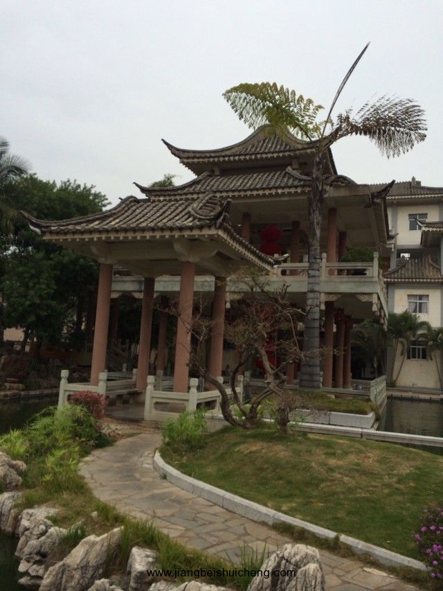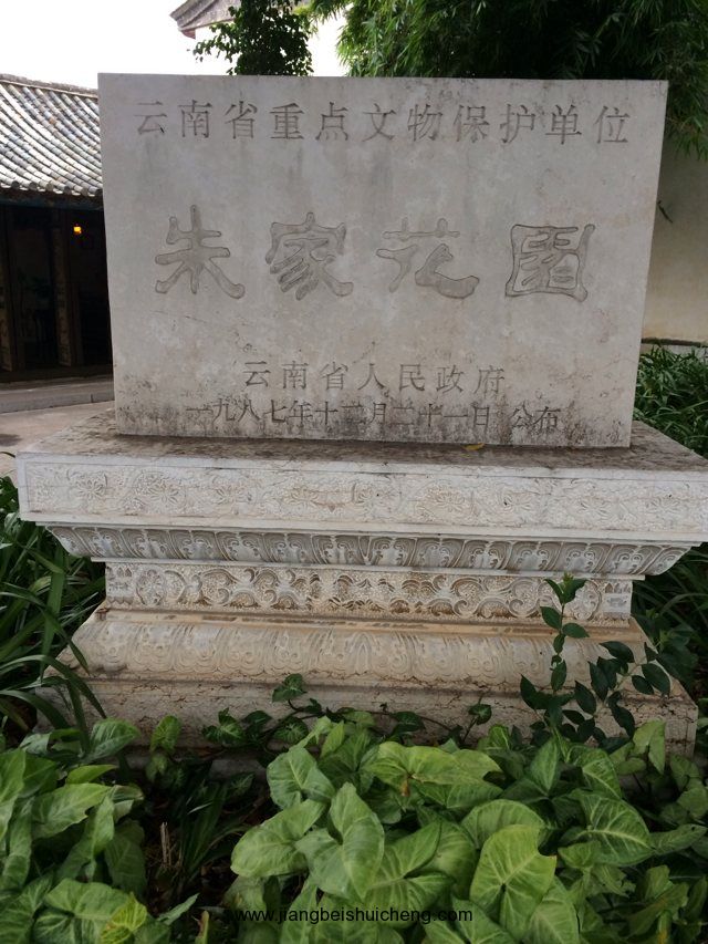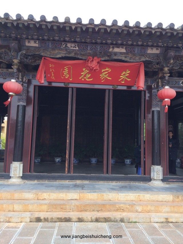朱家花園坐南朝北,入口為垂花大門。左側沿街的10間“呆腳樓”與其后的“跑馬轉角樓”相連,是當年的帳房和資供應鋪面等,是朱家經營進出口貿易,買賣大錫、洋紗布匹、食鹽、煙土的“朱恒泰”總商號。右側前為家族祠堂,后為內院。祠堂前有水池,水上有戲臺、亭閣、庭蔭花木等。水池邊有右欄。