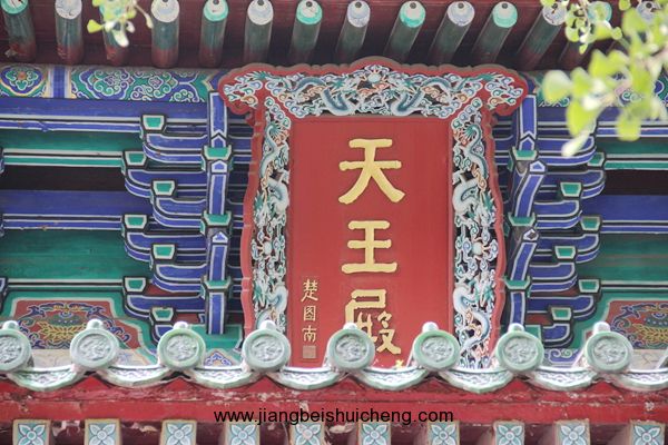 經(jīng)甬道過(guò)碑林后便是天王殿,三間重檐歇山頂?shù)钐茫饷嬗袃纱蠼饎偅瑑?nèi)里則是四大天王像,威武雄壯。