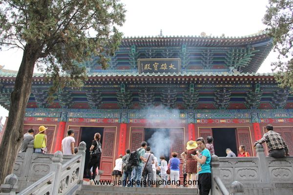 穿過(guò)天王殿,其后有大雄寶殿。殿內(nèi)供奉著釋迦牟尼、阿彌陀佛、藥師佛的神像,屏墻后面懸塑觀音像,兩側(cè)有十八羅漢侍立。大雄寶殿之后,又有藏經(jīng)閣藏書八百萬(wàn)卷,這是寺僧藏經(jīng)說(shuō)法的場(chǎng)所。