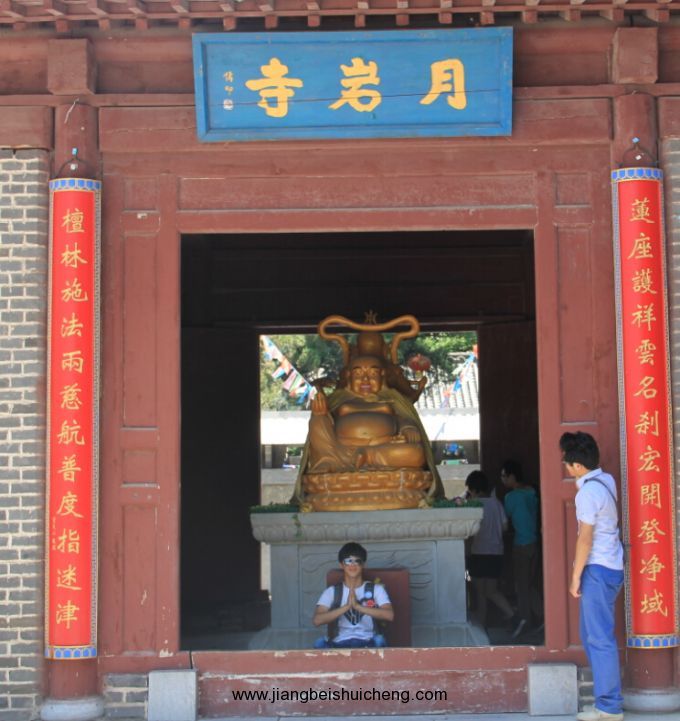 山坡上有一條新修建的臺(tái)階路,直通山頂。據(jù)當(dāng)?shù)乩相l(xiāng)說(shuō),上面有一尊大佛,還有古長(zhǎng)城圍墻。于是,雖然天氣炎熱,我們還是想一探究竟。臺(tái)階較陡,拾級(jí)而上不多時(shí)就汗流浹背氣喘吁吁。在半山腰山道左邊,一尊面目慈祥的石雕坐佛依山望湖。再往上,很快就登頂了,發(fā)現(xiàn)所謂的古長(zhǎng)城圍墻不過(guò)是用碎石堆砌而成。下山之后,我們繼續(xù)驅(qū)車?yán)@山而行,至山的背面,有一月巖寺。月巖寺坐落在昆山的西側(cè),一說(shuō)創(chuàng)建于漢代,一說(shuō)始建于唐代。其藏居深山,古樹掩映,晨鐘暮鼓方知山中有寺。