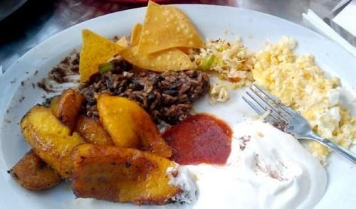 2.Platos Típicos 是薩爾瓦多一道典型的早餐,由薩爾瓦多標志性的食物構成,其中包括炸甜大蕉、casamiento(洋蔥汁拌黑豆米飯)和薩爾薩。