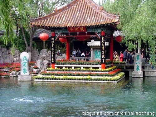 趵突泉景區在我們公園內西側,是全園構圖中心,由亭、堂、廊、榭組成了一個封閉空間,高低錯落的建筑像眾星捧月一樣,簇擁著噴突騰涌的趵突泉,人們可以從不同的角度欣賞泉景,被譽為濼水之源,在史書上第一次出現是<<春秋>>上關于魯桓公和濟襄公談判兩國邊界一事的記載。魯桓公十七年(公元前695年)。齊國和魯國因邊界爭執發生戰爭,次年春,魯桓公到齊國談判邊界問題,會齊侯(齊襄公)于濼。濼,濼水的源頭,即趵突泉。所以趵突泉為人所知已經有二千五、六百年的歷史了。當然那時濼水之源,名字并不叫趵突泉,北魏時,因泉上建有娥姜(英)廟,谷稱娥姜(英)水,直到唐宋八大家之一的北宋文學家曾鞏始稱為趵突泉,并流傳至今。不過,宋朝.金代曾有人稱叫“溫泉”、“檻泉”、“爆流泉”、“瀑流泉”等等,但都不如趵突泉這個名字精當傳神。