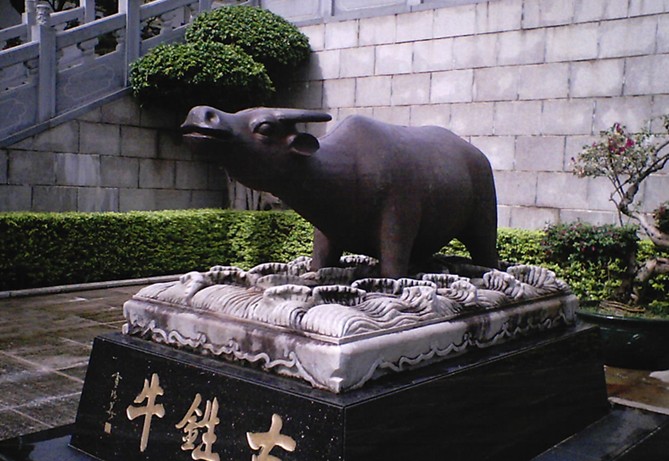入口是一座聳立的大石牌坊,三門歇山頂建筑,高16米,氣勢恢宏磅礴,正中題“東粵菁華”,兩側分別書有“金聲”“玉振”,皆是國學大師饒宗頤先生的手跡。牌坊到正殿是三進石階,院內花圃簇擁著石雕的麒麟、青獅、盤龍及鐵牛等吉祥物。