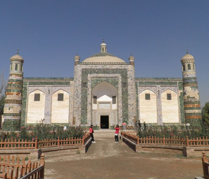 香妃墓坐落在喀什市東郊5千米的浩罕村,系自治區的重點文物保護單位。這是一座典型的伊斯蘭古建筑群,也是伊斯蘭教圣裔的陵墓,占地2公頃。 據說墓內葬有同一家族的五代72人(實際只見大小58個墓穴)。