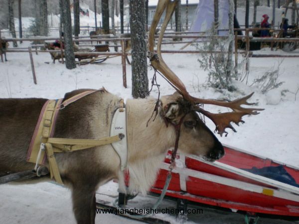 漫步到林邊有個(gè)以木欄圍著的鹿園。鹿在芬蘭是多產(chǎn)的動(dòng)物,有時(shí)車在公路上穿過樹林,也會(huì)見到一群鹿走過,又或者在路旁覓食。夏天它們懶洋洋地躺在草坪上養(yǎng)生;到了冬天,特別是圣誕節(jié)時(shí),它們卻成為圣誕老人及游客所專用的,拖著它們?cè)诼管囉谘┑厣巷w馳,讓雪花飄面,使圣誕卡上的情景活現(xiàn)于現(xiàn)實(shí)中,十分迷人。