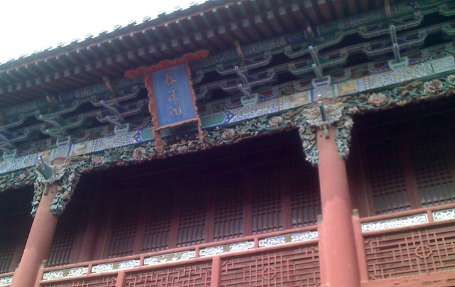 春秋閣為會(huì)館最后面、最高大的殿宇。面闊3間,上下2層,單檐歇山,灰筒瓦頂,斗拱抬梁式結(jié)構(gòu)。閣前廊有四根木質(zhì)檐柱,前廊額枋均為木刻透雕,雕飾人物和牡丹、金瓜、花卉等。