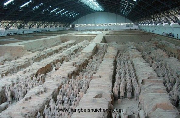 秦始皇兵馬俑博物館位于秦始皇帝陵以東1.5公里處,建筑在秦兵馬俑坑的原址之上。是世界最大的地下軍事博物館。秦始皇陵兵馬俑坑是秦始皇陵的陪葬坑。
