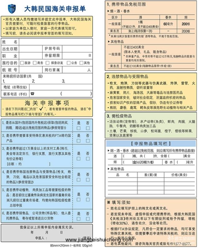 海關:每位旅客可免稅隨身攜帶烈酒1000毫升(一瓶),香煙200支(一條),香水2英兩。回國入境時,請勿攜帶違禁物品。
