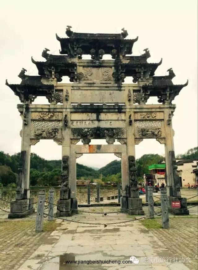 西遞鎮村前的牌樓西遞始建于宋朝的元祐(宋哲宗)年間,由于河水向西流經這個村莊,原來稱為“西川”。因古有遞送郵件的驛站,故而得名“西遞”。
