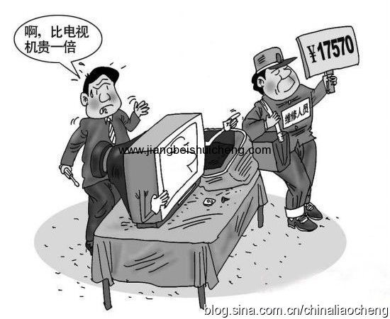 修理店接待人員:“看來你的電視是內部出了問題,那你要看內科,再請問你要看工程師還是高級工程師,修理費是工程師加收20元,高級工程師要加收30元。”