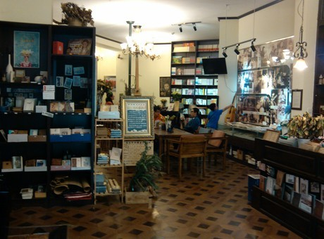 10月5日傍晚,我自青島嶗山坐304路公交車到棧橋時,被一處紅磚墻的德式建筑所吸引:黑框的玻璃窗透出柔和的光,旁邊掛了一塊牌子,寫著“良友書坊”四個字;門口擺了幾盆花草,兩邊各有一盞像中世紀騎士頭盔似的燈,左邊上方的牌子上寫著“閱讀 咖啡 藝術”,下方的小黑板上寫著“始建于1901年的百年德式老建筑,膠澳德意志帝國郵局舊址,現為青島老城文化地標良友書坊,主營圖書、展覽、畫廊、咖啡、慢遞、花朵、服裝等”,貌似是用黃色的粉筆手寫而成的。