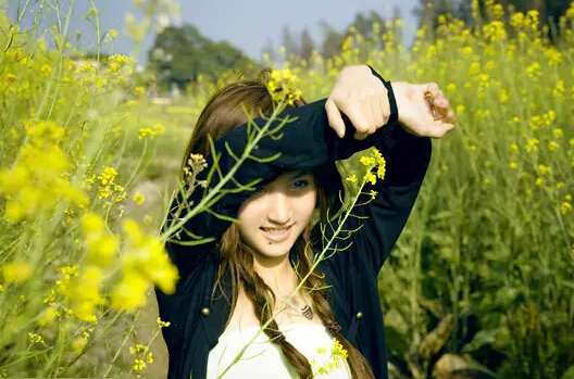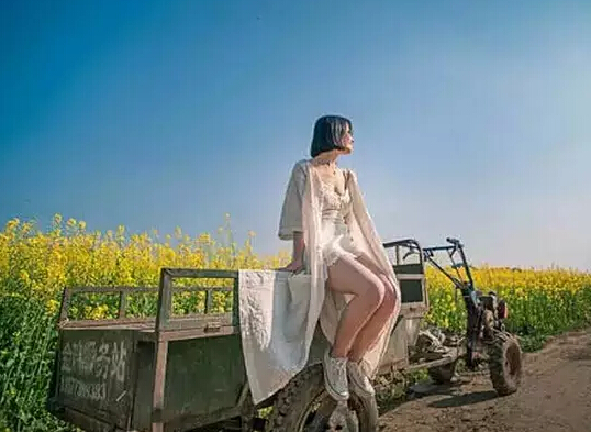 油菜花屬于清新系列的色調,搭配的服裝,顏色一定選擇淺色系的,千萬不要想著去和花爭艷,穿個大紅大紫的。