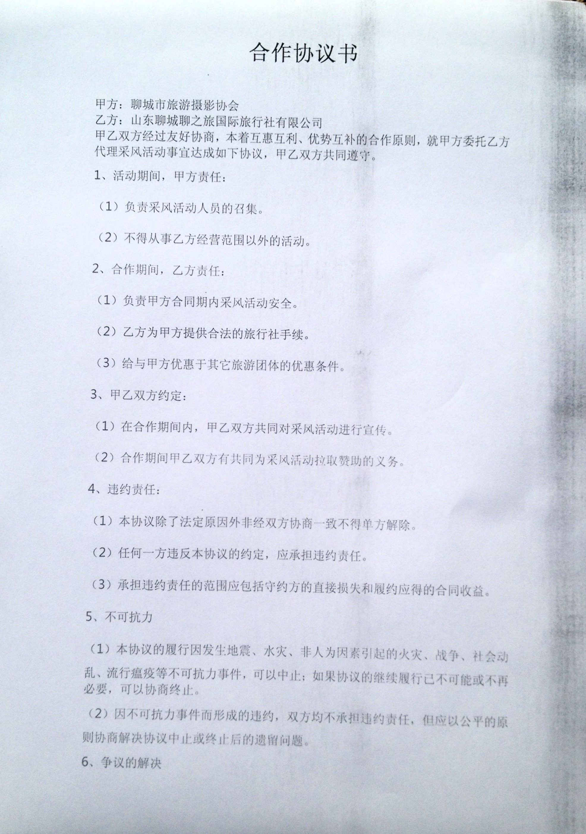 聊城市旅游攝影協(xié)會(huì)委托山東聊城聊之旅國(guó)際旅行社有限公司代理旅游事宜合作協(xié)議