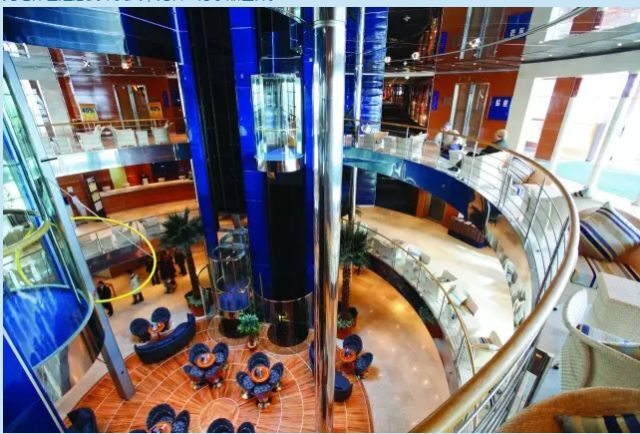 ?走進中廳,一眼竟能仰望到10層甲板,大堂的柱狀吊燈是由意大利著名Murano玻璃制成,透明的觀光電梯也是意式華美風,宛若一方水晶世界。
