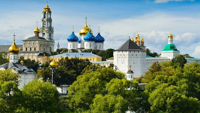 【圣三一修道院】(內觀約1小時)是東正教最古老的教堂建筑群之一,里面有許多著名的俄羅斯建筑古跡。其中最古老的是三位一體教堂,里面安放著謝爾蓋院長的棺木。周圍坐落著圣靈降臨教堂、圣母升天教堂、圣謝爾蓋教堂、左希姆和薩瓦提等教堂。它的建筑精華包括:用白色半寶石砌成的圓頂、黃金雕成的壁上橫木、由魯伯里歐夫所繪圣像裝飾而成的圣像門等,都是令人贊嘆的藝術杰作。以畫《三位一體》而出名的俄羅斯畫家安德烈·魯布廖夫的壁畫作品一度收藏在教堂中,現在則收藏于莫斯科的特列基亞科夫畫廊。