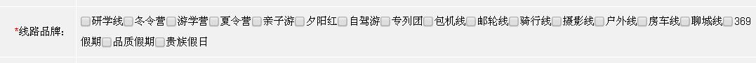 (3)線路品牌:可多選。 (線路品牌有嚴格的限制,比如攝影和戶外線,這個是需要專業領隊帶隊的,再,包機線路,必須是包機線路才可以,不是所有的飛機團都是包機;線路必須定位準確,客戶才能最短時間找到哦。這個選項不是必選的,常規的行程可以選擇后面三個 369假期,品質假期,貴族假日 其中一個 分別代表公司產品低端 中端 高端 的分類)