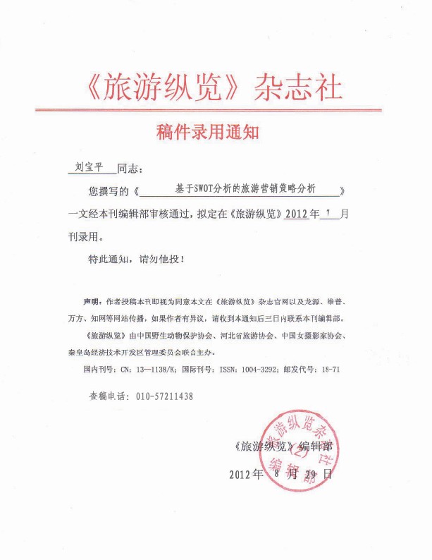 《旅游縱覽》雜志社稿件錄用通知