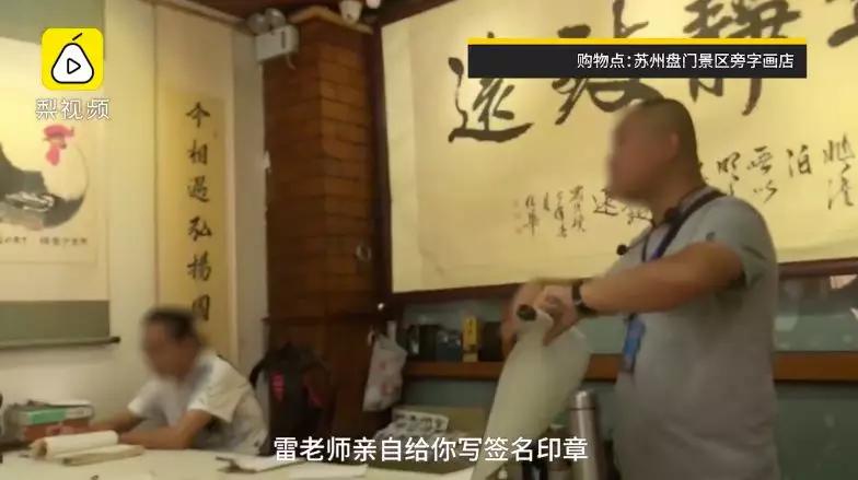 在購物點蘇州盤門景區旁字畫店里,游客們又被忽悠買來歷不明大師的字畫。
