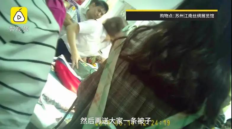 在購物點蘇州江南絲綢展覽館內,導購以低價和送被子活動吸引游客購買商品。