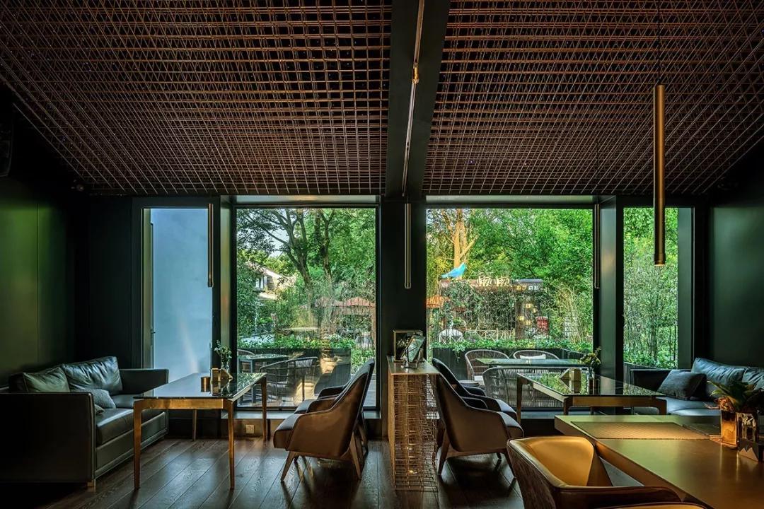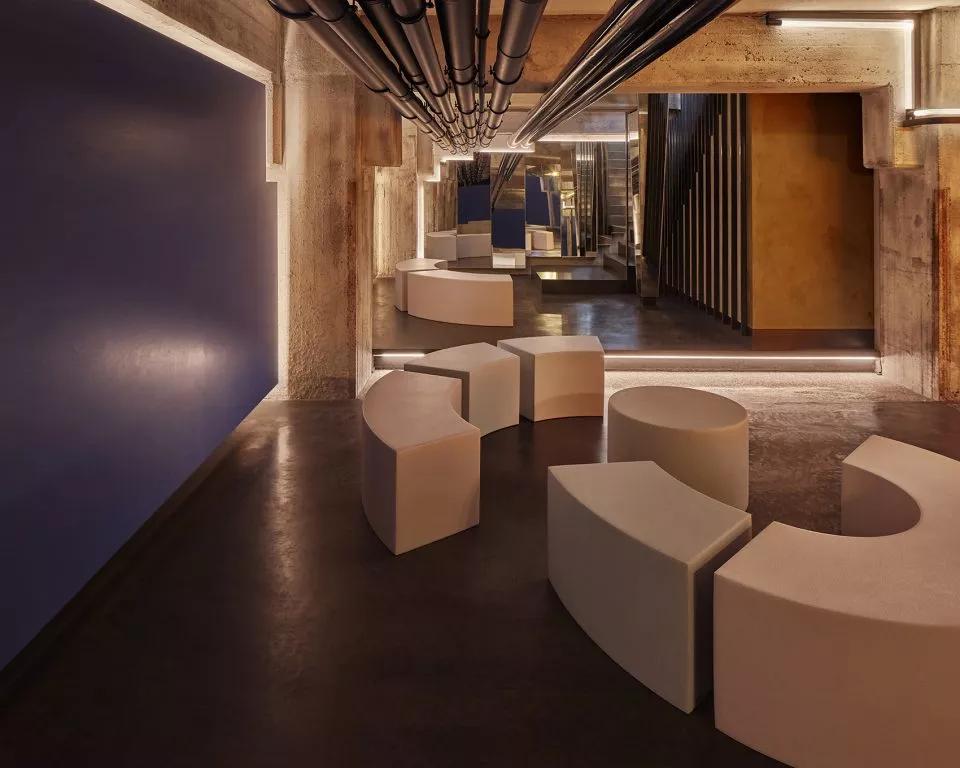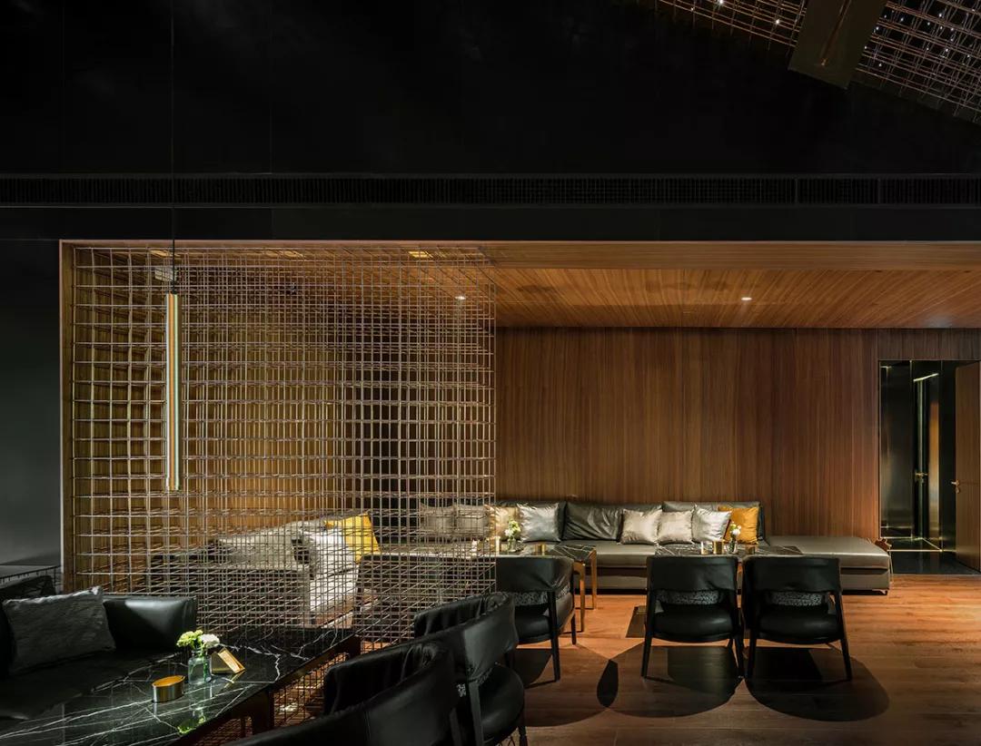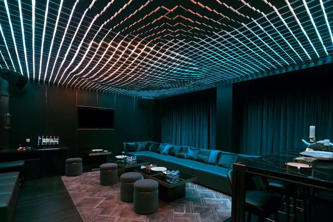 酒吧區(qū)域是一個動態(tài)空間,室內(nèi)的現(xiàn)代化裝飾則與外界古色古香的建筑群形成強(qiáng)烈對比,數(shù)字化設(shè)計的黃銅立體網(wǎng)格結(jié)構(gòu)貫穿室內(nèi),將酒吧的各個空間串聯(lián)在一起。延伸的吧臺、舞動的頂面、變換的星空頂燈制造出不同的視覺感受,引導(dǎo)人逐個探索每一個角落。酒吧區(qū)沒有采用尋常酒吧中常見的電視、投影設(shè)備以最大程度減少對人的擾動,營造一個可以靜思、可以真正意義上產(chǎn)生思想碰撞的空間。KTV舞動的頂面造型設(shè)計以數(shù)字矩陣為靈感,也是虛擬未來的象征。不同模式的燈光演繹讓音樂在這有了實體的呈現(xiàn)方式,音樂的流動可以被視覺捕捉,活躍了整體空間的同時也增加了多感官交流。