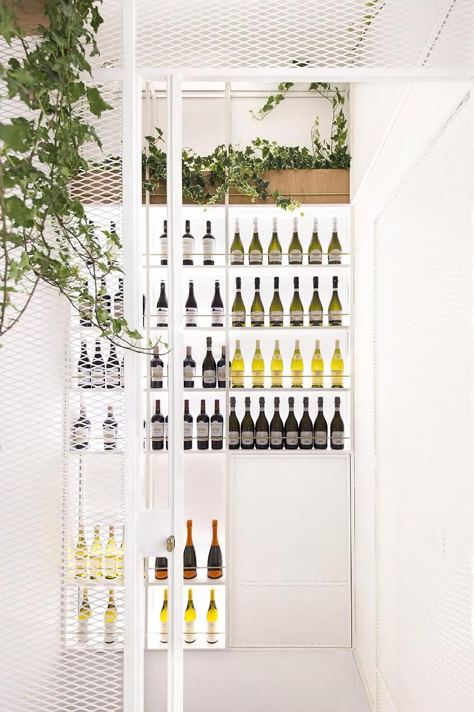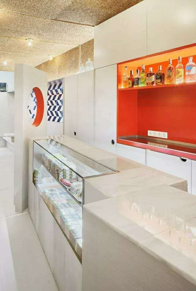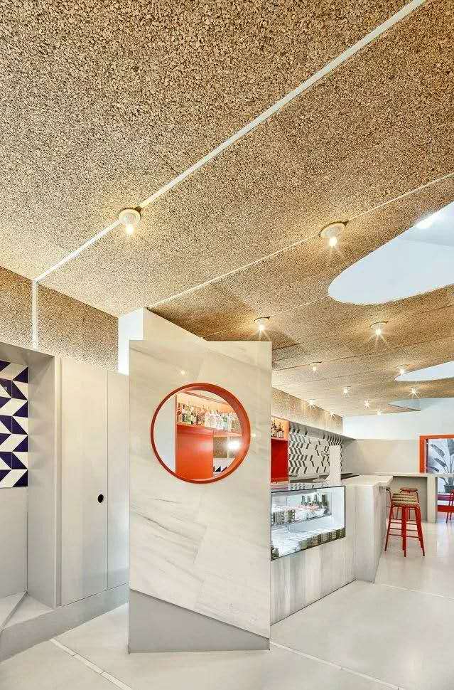 考慮到公共場所的聲學(xué)要求,室內(nèi)天花板和部分側(cè)面已經(jīng)覆蓋了軟木面板,這是一種吸音材料,因此可以避免混響,也可以減少對鄰居的干擾。軟木飾面的塑料品質(zhì)被用作建筑的主要裝飾主題。這種材料其切割產(chǎn)生的條紋在原處和放置天花板的地方制造出韻律感,使得燈泡看起來像是懸浮著。在這個天花板上制作了一系列凹洞,突出了內(nèi)部的節(jié)奏,并尋求一種自然天頂照明的感覺。大部分的墻壁都有輔助工作條,與內(nèi)襯藍(lán)白相間的斜面瓷磚和白色瓷磚相一致。折疊屏風(fēng)、吧臺、高腳椅和桌子,每一種元素的奇異性賦予酒吧每個部分不同的性質(zhì),為尋找不同風(fēng)格座位的顧客創(chuàng)造不同的氛圍。