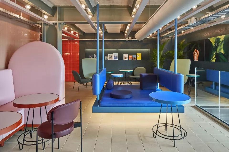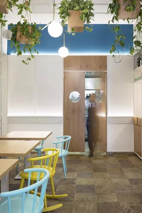 室內(nèi)的定制家具和精致的配色方案受到了陶瓷生產(chǎn)過程的啟發(fā):空間中的藍(lán)色、灰色、粉紅色和黃色涂料呼應(yīng)了生產(chǎn)工藝的開端,利用水和黏土塑造出類似于陶器模具的體量。陶器模具的形狀以及用于生產(chǎn)陶器的工具被再次利用,成為造型獨特的工業(yè)吊燈,并將室內(nèi)空間劃分為不同的區(qū)域。堅硬的幾何形狀與柔軟黏土塑造出的形體共同構(gòu)成了大膽而和諧的內(nèi)部空間。