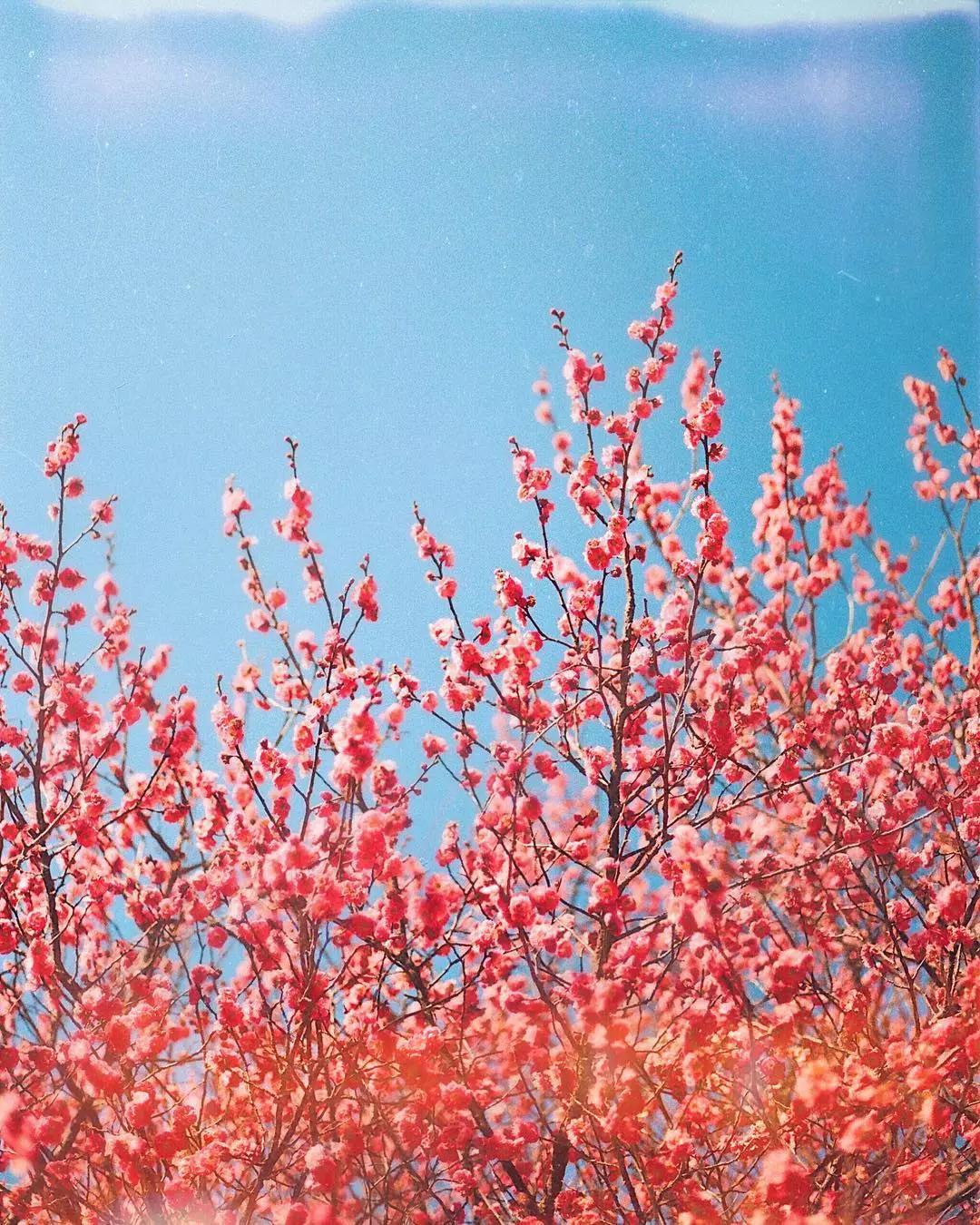 留白簡直是拍照的萬能公式,不管什么都可以這樣拍。畫面不需要太多元素,找好角度,多把開花的樹枝處在畫面的對角處,采用對角線構圖。