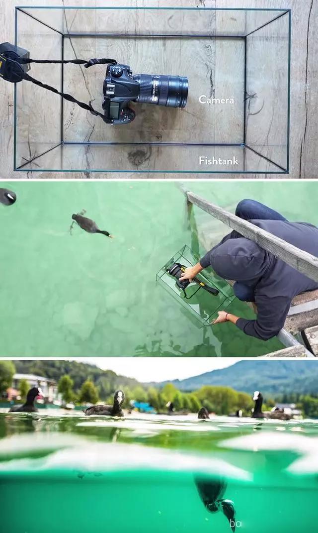 把相機放進一個玻璃盒子里可以拍出水上水下的畫面,同理手機放進深玻璃杯也是可以的。