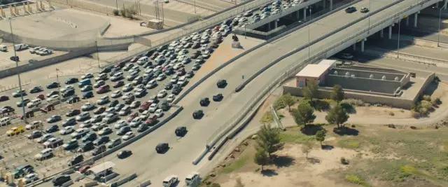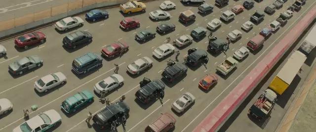 AC:電影前20分鐘是一段非常有沖擊力的片段,Emily Blunt飾演的角色和她的隊伍開進(jìn)華雷斯(邊境城市)。這個片段里混合航拍鏡頭和在車上的鏡頭,展現(xiàn)他們越過邊境
