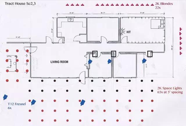 Deakins: 我的圖只是粗略的設(shè)計,只是用來和我的燈光師溝通,看哪里需要什么燈。T12和天空燈是事先安裝好的,但這些燈不是用來照演員臉的,T12沒法照那么遠(yuǎn)。