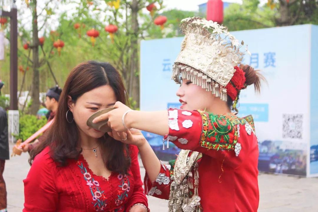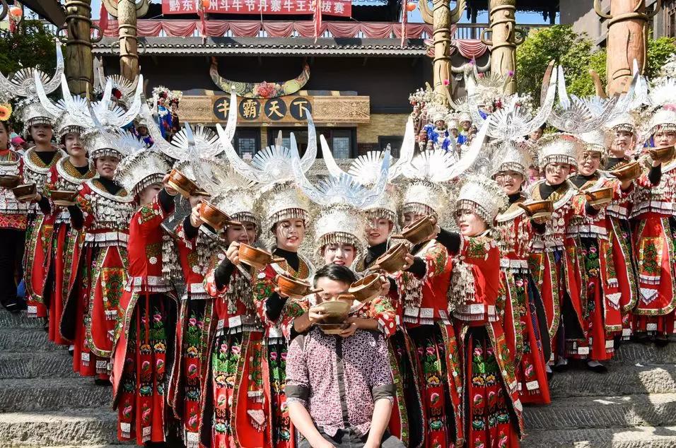 穿著盛裝的苗族姑娘們,端起小酒杯,邊舞邊唱,一時間敬酒歌四起。