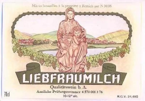 Liebfraumilch:“圣母之乳”。一種廉價的、半甜型的QBA酒,產自于萊茵高、那赫、萊茵黑森和法爾茨四個地區,大多用高產量的穆勒塔戈葡萄(Muller-Thurgau)釀造。Lieb是德語“親愛”的意思,Frau意為“女士”,Milch意即“牛奶”。