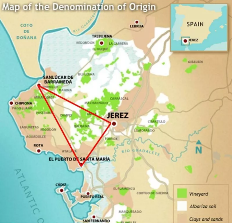 雪莉三角區(qū)位于西班牙西南部的安達(dá)盧西亞自治區(qū)。主要產(chǎn)地是赫雷斯(Jerez),再加上兩座海邊小城Sanlúcar de Barrameda和El Puerto de Santa María。全世界的“真”雪莉,只產(chǎn)自這三個(gè)地方。