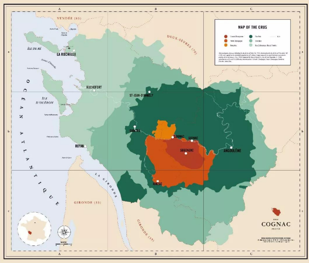 干邑產(chǎn)區(qū)位于法國西部,圍繞著同名的干邑市展開(Cognac)。如果你熟悉法國地理,你立刻就能發(fā)現(xiàn),干邑產(chǎn)區(qū)其實就在波爾多隔壁。