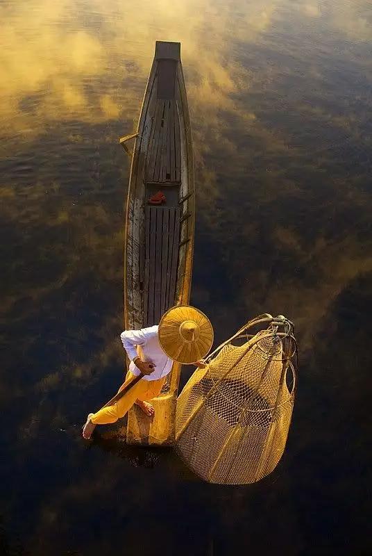 夕陽西下,頭戴斗笠的漁民,一手拿捕魚的簍子,一手拿著船槳,準備上岸回家吃晚飯。