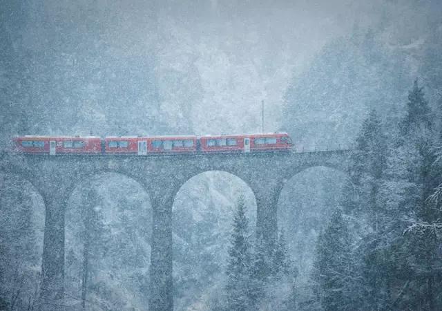 瑞士下了一場大暴雪,火車迎著暴雪,在橋上艱難地前行著,猶如童話中的場景。