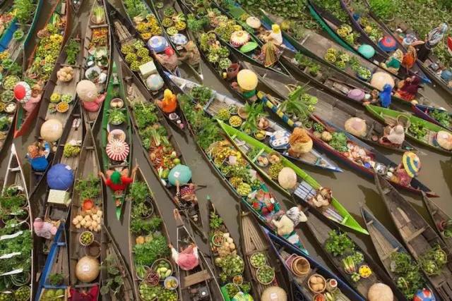 在泰國,菜市場不在地上而在水中,各種新鮮的水果和蔬菜被放在一條條狹窄瘦長的小木船上進行售賣。顧客買東西很有意思:要從這條船上跨到另外一條船上。