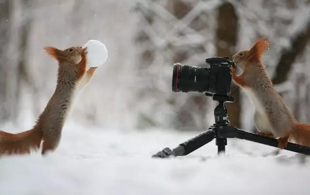 兩只小松鼠,一個當模特,一個當攝影師在雪中拍照,可愛到爆!