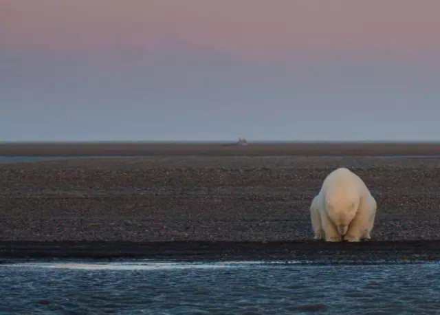 因為全球氣候變暖,冰雪融化,一只北極熊孤獨地蹲在岸邊,無家可歸。