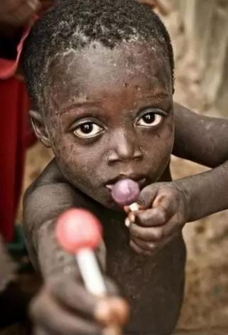 這是非洲難民區(qū)的一個孩子,常年忍饑挨餓,他有幸得到兩個棒棒糖,卻依然堅持送攝像叔叔一個棒棒糖。