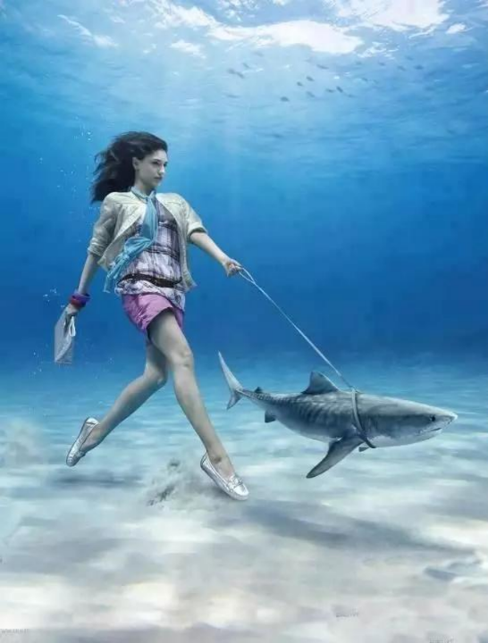 一位衣著時尚的美女,左手牽著鯊魚,右手拿著包包,這種海底逛街的方式真的太潮了!