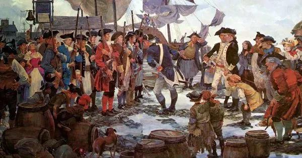 這位大財主名叫約翰·漢考克,1768年,漢考克繼承了他叔父托馬斯·漢考克的貿易業務(實際是走私葡萄酒等貨物)。當時作為日不落帝國的英國為與荷蘭爭奪海上霸主地位,立法規定運往英國或英屬殖民地的貨物必須由英國人裝船押送,并向英國交稅。但經歷了英法七年戰爭后,英國國庫空虛,對殖民地的賦稅層層加重。是可忍,孰不可忍。漢考克立刻帶領人民進行反抗。