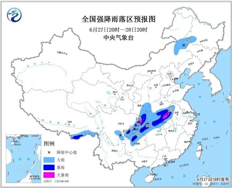 ·27日20時(shí)至28日20時(shí),四川東部和南部、重慶、貴州北部、云南東北部、陜西東南部、河南南部、安徽西北部、湖北中西部、湖南西北部等地的部分地區(qū)有大到暴雨,其中,重慶北部、四川東北部、河南南部、湖北東北部等局地有大暴雨,最大小時(shí)降水量30~60毫米,局地可達(dá)70毫米以上,并伴有雷暴大風(fēng)等強(qiáng)對(duì)流天氣。
