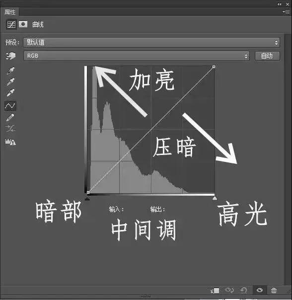 曲線調(diào)整圖層跟色階一樣的是都有直方圖,并且直方圖從左到右依次表示的是圖片在陰影,中間調(diào)和高光的像素分布。