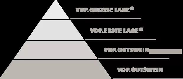 VDP酒莊使用著一套與德國官方葡萄酒分級同時存在,卻又完全獨立的分級系統。眾所周知,1971年頒布的德國官方葡萄酒分級以葡萄成熟度為標準,但這個標準過于片面,難以區分酒的真實品質。為了解決這個問題,VDP建立了聯盟內部的分級制度,最新的分級制度更新于2012年,以勃艮第的風土理念為出發點: