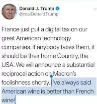 “雖然我不喝酒,但比起法國,我更愛美國葡萄酒。”特朗普26日在社交媒體發(fā)文對此前法國的數(shù)字服務(wù)稅做出回應(yīng)…