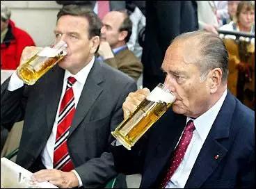 ▲ 法國前總統(tǒng)希拉克與德國前總理施羅德喝啤酒