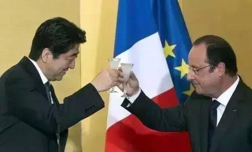 ▲ 在2014年的一場宣傳日本料理的活動(dòng)上,日本首相安倍晉三和法國前總統(tǒng)奧朗德品嘗日本清酒