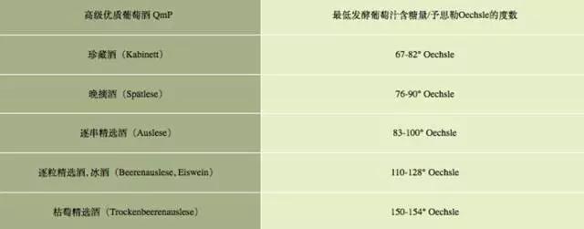 其最低含糖量的標準用予思勒(Oechsle)來表示,一度予思勒表明一升葡萄汁比一升水重一克,具體標準如下(其范圍是因為各產區標準不一):