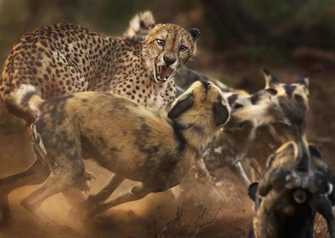 這只上了年紀的獵豹發出一邊發出“嘶嘶”地叫聲,一邊蓄力向這群野狗發起攻擊,它的左耳在打斗中被咬破,右耳在喧鬧的聲中緊緊壓下。攝影師 Peter 的鏡頭緊緊地跟著獵豹的臉,拍下了這場罕見的相遇。(由于棲息地的流失和被破壞,這兩個物種都已經從他們大部分曾經的棲息地中消失。)
